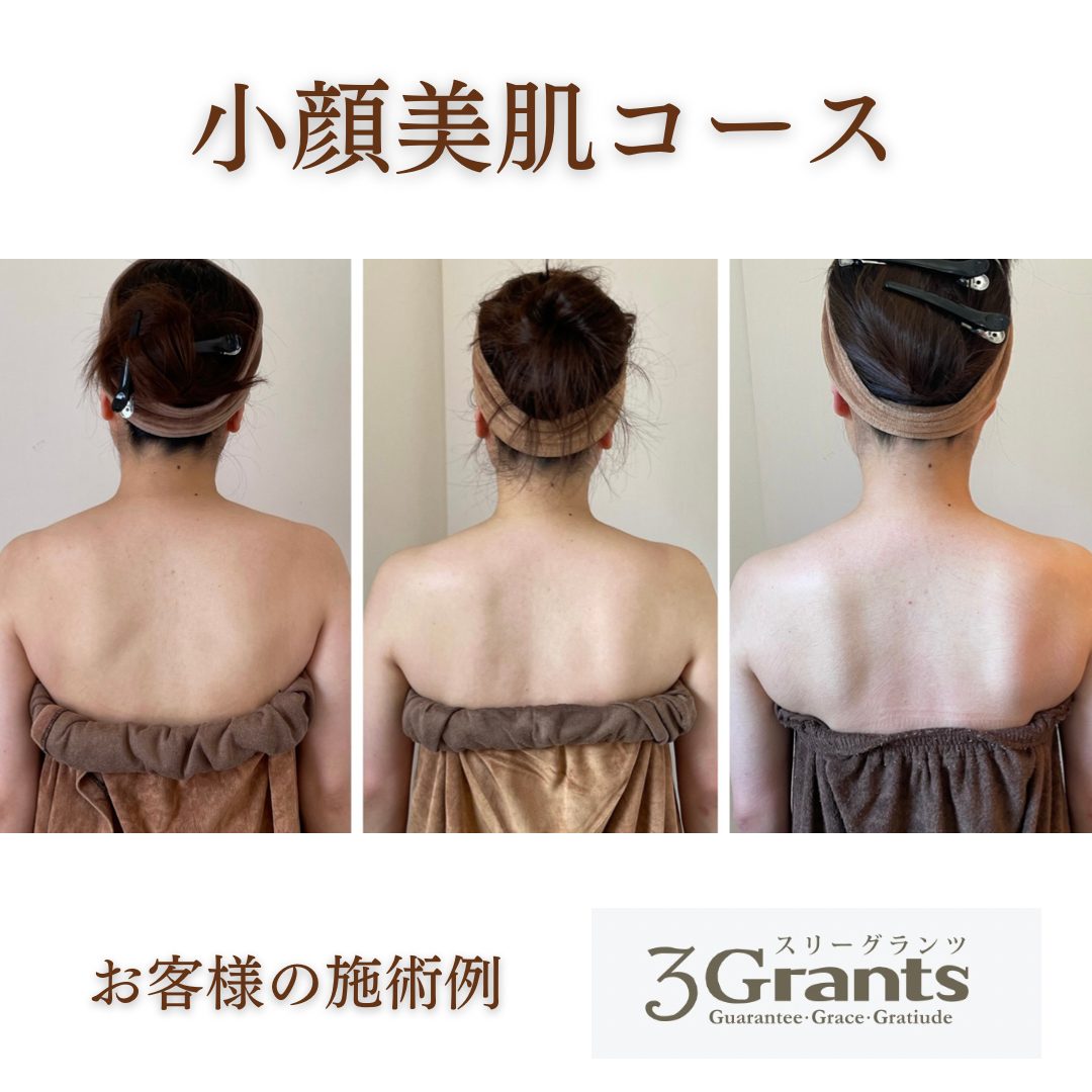 フェイスラインも気になるところ。フェイスラインはもちろん肩甲骨もマッサージしていくので小顔コースでありながら後ろ姿美人も目指します。スリーグランツ公式ラインやInstagramからのご予約も可能です。